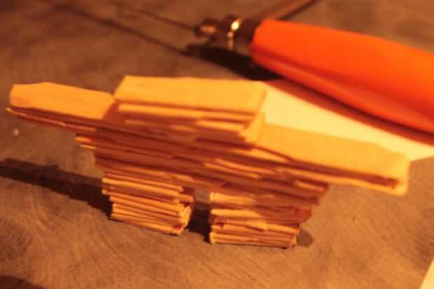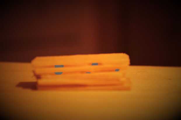partes:1. cuñas de madera de2. pegamento de carpintero3. cinta4. las abrazaderas de muellePaso 1: Unir cuñas de madera 1. pegan cuñas de madera para formar una pieza sólida de madera2. Utilice abrazaderas para conseguir un asimiento sólido.Paso 2: Co