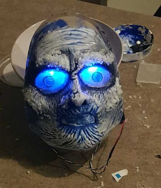 Cuando era feliz que entonces solía látex se adhieren las gafas a la lente y la lente en la cavidad del ojo. Encontré un lugar para los dos LED en la parte posterior de la lente para el mejor resplandor nuevamente utilizando látex celebró los LEDs y los cables para viajar a lo largo de la parte trasera de la máscara. Utilicé varias capas de látex en los cables para que se sientan naturales con la misma textura que el resto de la máscara.