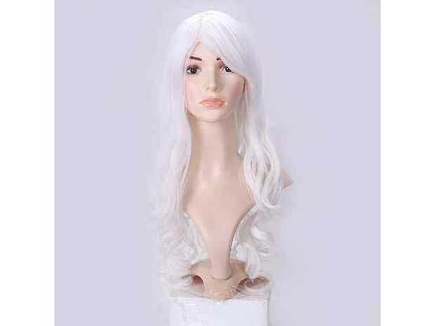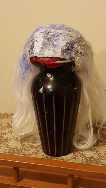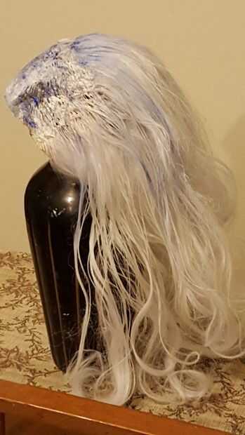 Ahora era tiempo para trabajar en la peluca. La peluca blanca más barata que pude encontrar fue lamentablemente muy de moda con flequillo lateral y rizos en la parte inferior para las mujeres. Tuve que hacer un poco de trabajo para lograr la apariencia que tenía en mente a partir de zumbido apagado todos los hilos en la parte delantera, creando una zona de la frente grande. Luego apliqué látex a todas el pelo corto populares establecen plana mientras que también la creación de una capa base de una frente de aspecto natural. Luego pinté con los mismos colores y técnicas como la máscara. Siguiente paso fue hacer el resto del cabello no tan "bonito". Pulveriza mucho detangler pelo así que finalmente he podido conseguir un cepillo para ejecutar a través de él. Tengo el pelo para enderezar un poco con un peine de endurecido en el resplandor en el oscuro maquillaje crema y laca extra rígido.