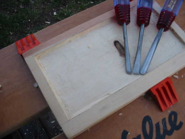 Haber, tamaño y cuadrado ambas tablas el siguiente paso fue hacerse con un hueco para recibir la cera, superficie de escritura. Sobre todo esto se hizo con un cincel el escopleo con gubia, una herramienta con una "C" sección diseñado para eliminar una gran cantidad de madera. El alisar de la hendidura se hizo con plana talla cinceles para el plano de fondo y laterales con grano y escoplos de carpintero para el final las paredes de cavidad de grano. Este proceso de talla sorprendentemente resultado para ser muy diferente para los dos tableros; una tabla tallada muy fácilmente, pero es más difícil de cortar verticalmente el extremo de granos, la otra tabla fue más difícil cortar e intentó agarrar la gubia y funcionar más allá de mis marcas.