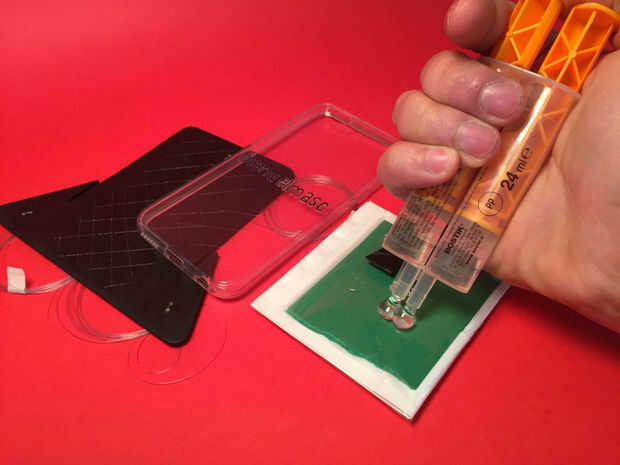 Para hacer la Unión tan fuerte como pude, usé el cuchillo x-acto hacer poco puntuaciones tanto en la parte posterior de la caja y en el pedazo más grande de centriphone (2 º y 3 º foto) antes de pegar las piezas con resina epóxica bicomponente.