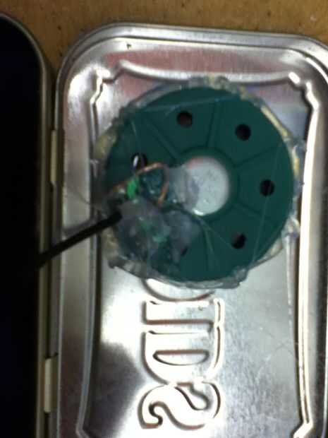 Poner una capa extra de fieltro para que los cables de abajo son difíciles de ver. Esto es opcional, pero ayudan a proteger tu ipod, y es el interior de la lata mirar más fresco. Usando el punzón y martillo, hacer un agujero en cada punto marcado en la parte superior de la lata. Pegamento caliente el altavoz sobre los orificios como se muestra en la imagen. Asegúrese de que el altavoz está realmente en el lugar porque no quieren venir aparte dentro de la lata. También, no consigue ninguÌ n pegamento caliente sobre el diafragma del altavoz.