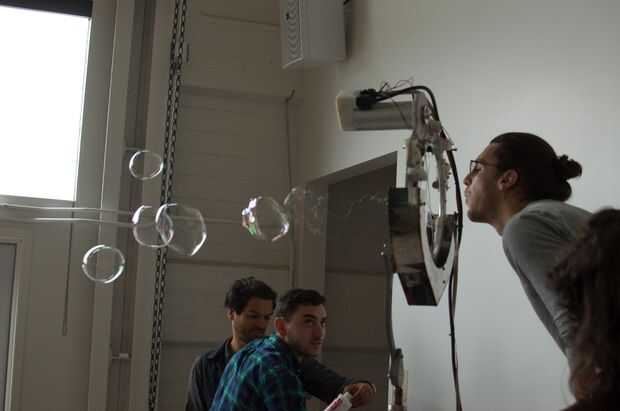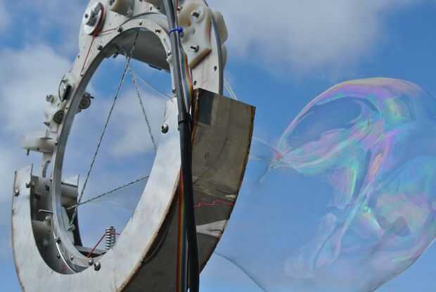 El iris de la burbuja CNC hace grandes pompas de jabón en una nueva manera, tejiendo cadenas jabonosa juntos y aparte con un iris motorizado. Fue diseñado para permitir que grandes burbujas de jabón hacer automáticamente con gran repetibilidad, abriendo nuevas posibilidades interesantes para el arte, la ciencia y de la ingeniería con pompas de jabón a la carta de tamaño controlado y el momento.
