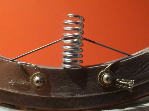 Un aspecto agradable de este diseño es que la primavera, que es una hélice, es ajuste del propio tornillo. El cable pasa entre vueltas del resorte, y para aumentar o disminuir tensión uno sólo necesita torcer el resorte en la dirección adecuada. En la práctica, la fricción impide que aflojar muy bien. Este tensor se mejoró mediante la colocación de un tornillo a través del centro de la primavera, para mantenerlo alineado e impedir su pandeo.