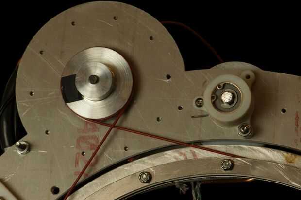 Elegí acoplar el giro del motor a la rotación del diafragma mediante un sistema de cable y polea. El cable sigue un curso Figura 8 alrededor del aro giratorio de iris y la polea del motor.