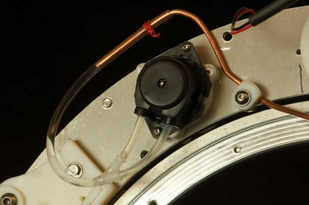 Quería ser capaz de encender y apagar y modular, la entrega líquida en los cables, así que utiliza una bomba eléctrica pequeña y controlada con un MOSFET pequeño y uno de los pines de salida del microcontrolador Teensy, cuya producción podría ser modulada por modulación de anchura de pulso (PWM). El líquido se suministra para el cable superior por un tubo rígido que es fijado firmemente al bastidor con una abrazadera 3D impresa y doblado manualmente en posición exacta. Líquido sigue tensión gravedad y capilares para mojar todas las cuerdas restantes cuando el iris se cierra y en la configuración "Y invertida".