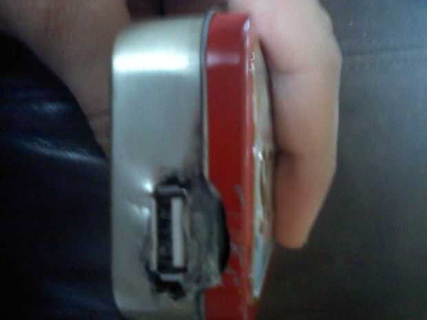 del extremo, dejar espacio para el impulso de menta. Entonces despues de que ponga su roja led de agujero junto su conmutador. y en la parte posterior, cortar un área del puerto usb, 1 de la izquierda y corte un poco más ancha que la usb puerto es y va ligeramente hacia abajo más allá de la altura del puerto usb. Entonces justo al lado del LED infrarrojo, perfore un orificio de 2 mm para la luz de flash LED y debajo de ellos, hacer una muesca cerca de la mitad una pulgada de ancho y 1/4
