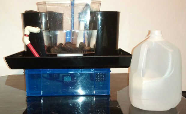 Llene el depósito con 2 galones de agua. Llene la pecera con un galón de agua. Llene cada cama crece sobre un galón de agua. Enchufe la bomba!