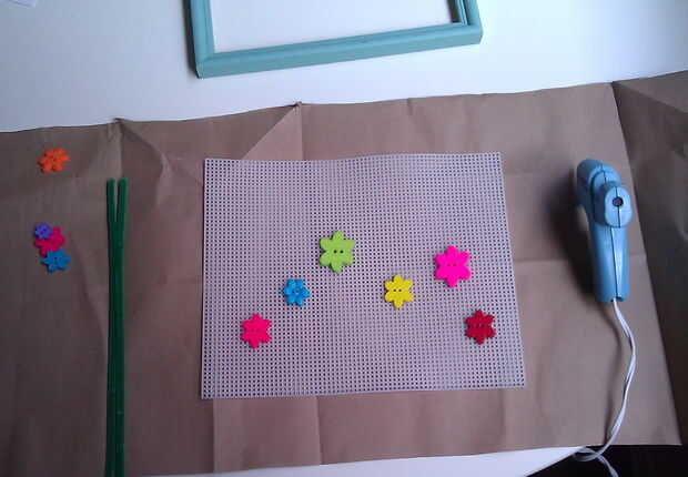 Después de cortar la lona plástica de malla para adaptarse a la estructura, colocar los botones en el lienzo. Ser conscientes de la dirección de los agujeros de botón como este es donde usted pondrá sus pendientes.