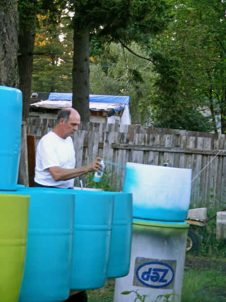 Una vez que los barriles estaban secos podríamos pintarlos. Lo hicimos usando Touch Rustoleum pintor 2 x Ultra pintura cubierta + imprimación pintura de aerosol. Funcionaba bien y los colores eran impresionantes, cepillar pintura en todos los tambores habría sido mucho más rápido y fácil. Y porque era la pintura de aerosol, necesitaban ser rociado dos veces para dar una buena capa uniforme. Mi esposo no es como no paciente al pintar y no exigente como yo, así que sólo les dio una mano. Hizo alguna diferencia para mí, pero no lo suficiente para que sea digno de aplicar una segunda capa. Una vez que el suelo era en ellas apenas podía ver las imperfecciones y podría descansar. Bueno bastante es bueno bastante a veces.