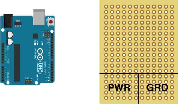 Tomar su protón- y usando un marcador permanente, marcar una sección del tablero de alimentación (positivo) y tierra (negativo) como se muestra en la imagen.