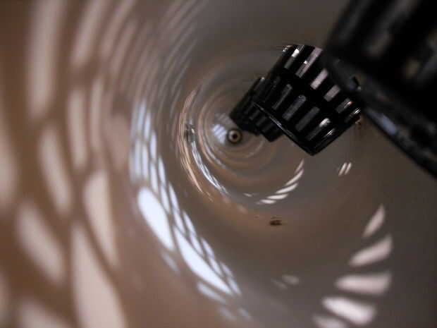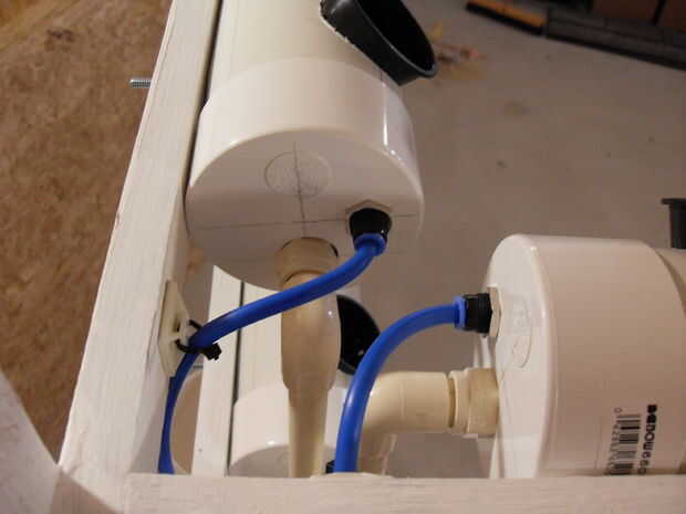En el otro extremo del tubo es otra tapa con agujeros perforados para el abastecimiento de agua y desagües. La instalación de la tubería de desagüe es un adaptador roscado macho CPVC 1/2 pulgada. El extremo roscado del adaptador se inserta en el tapón y asegurado en el interior, primero con un anillo o de goma y luego con una tuerca de seguridad 1/2 pulgadas PVC. El conector de línea de suministro es una Unión de tabique hermético de 1/4 pulgada O.D. tubería también fijada a la tapa con un anillo o de goma y tuerca de fijación.