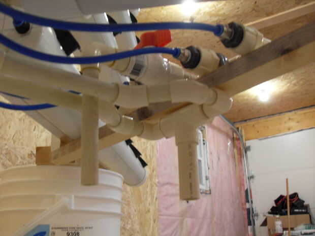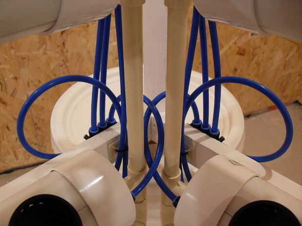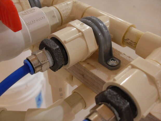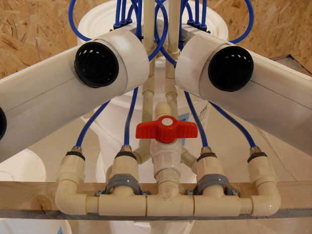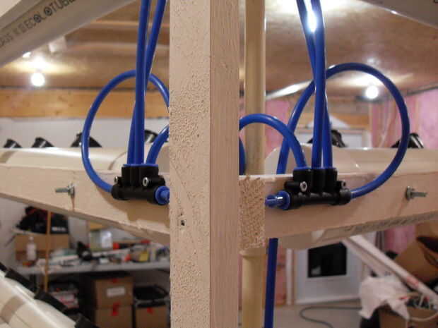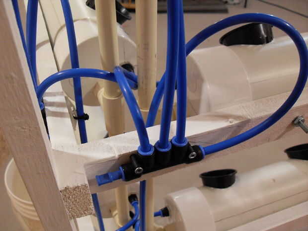 La principal fuente de conductores de línea en el colector principal de la distribución, con una válvula de bola CPVC de 1/2 pulgada en el medio para proporcionar control de flujo en los tubos de crecimiento. El colector principal de la distribución tiene cuatro salidas, cada una de ellas fuente 3 crecen tubos. Las salidas de los colectores se convierten de la pulgada del 1/2 CPVC para tubería flexible de 1/4 de pulgada en los siguientes pasos: