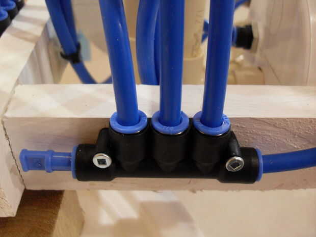 Cada línea de suministro desde el colector principal a su vez alimenta un colector más pequeño para un total de cuatro. Los colectores más pequeños son realmente un tipo de conexión que se puede comprar por el tubo flexible de 1/4 de pulgada. Tiene una entrada y cuatro salidas. Una de las salidas es taparlo con un tapón de empuje 1/4 de pulgada mientras que los otros 3 cada uno alimentar un tubo crece.