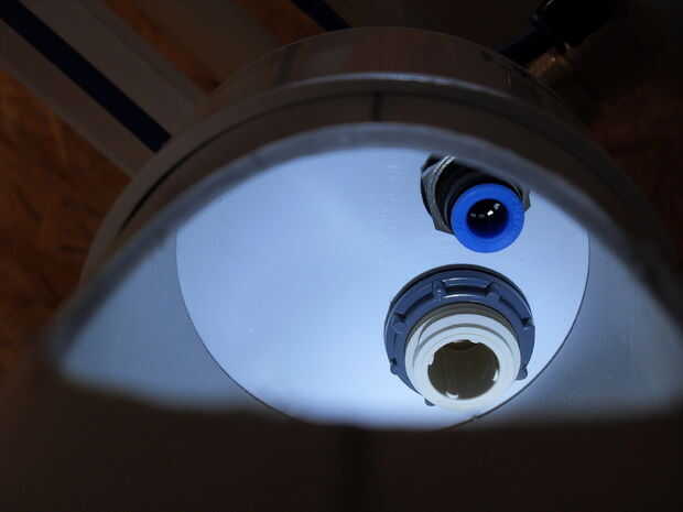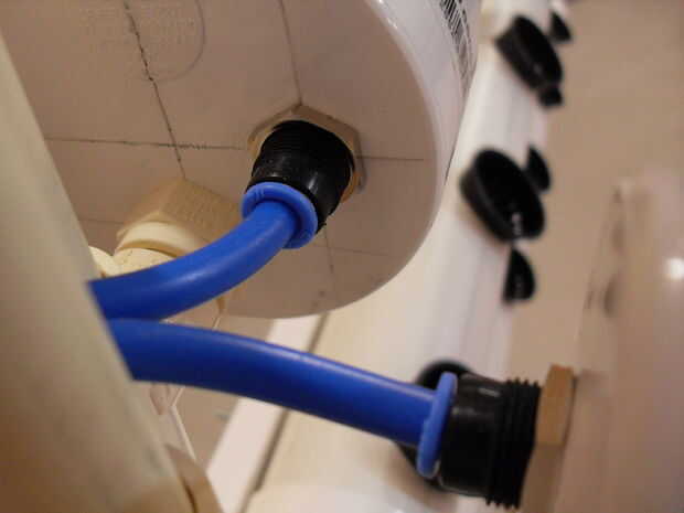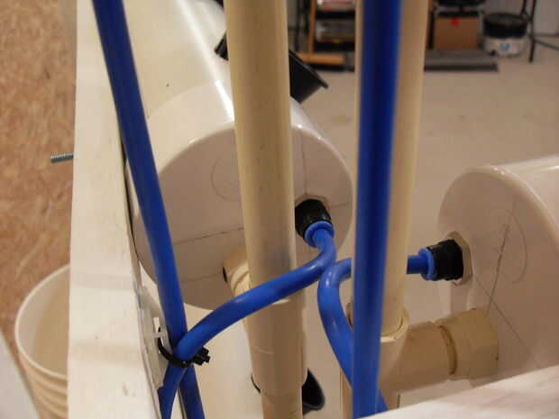 Cada tubo crece se suministra con una sola línea de tubería de flex que se conecta a través de la Unión de empujar-a-conecta tabique hermético de 1/4 de pulgada instalada en la tapa del extremo. La Unión de empujar-a-conecta tiene una conexión estanca al agua de la tubería tanto en el interior y exterior del tubo. El plan es tomar un trozo de tubería de 1/4 de pulgada sobre la misma longitud que el tubo crece, meter un montón de agujeros de alfiler en él todo a lo largo de la tubería, ponga una tapa en un extremo y conecte el otro extremo de la Unión del tabique hermético de empujar-a-conecta dentro del tubo de crecer. El resultado funciona como una manguera de remojo que esperemos que rociar agua en todas direcciones y obtener las raíces de la planta bonita y saturado.