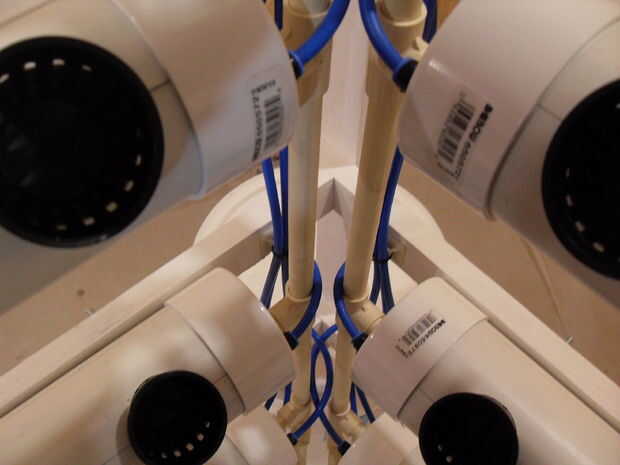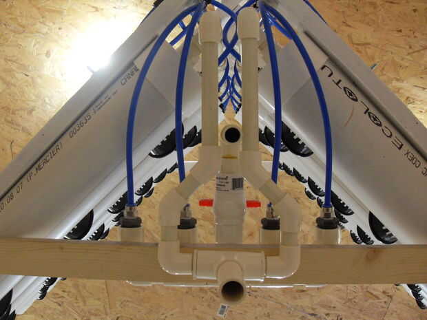 Un colector de desagüe vertical une los tubos crece 6 de cada columna. Hay un total de dos colectores de desagüe. En la parte inferior de cada colector es una toma de corriente. Las dos salidas se conectan entre sí a través de dos 1/2 pulgada para bujes CPVC de 3/4 de pulgada y un tee CPVC de 3/4 de pulgada. La expansión de 1/2 pulgada a 3/4 de pulgada en el punto de conexión o puede no ser necesaria pero desde esa sección 3/4 de pulgada de la tubería se manejo de la carga de ambos colectores pensé que es mejor prevenir que lamentar.