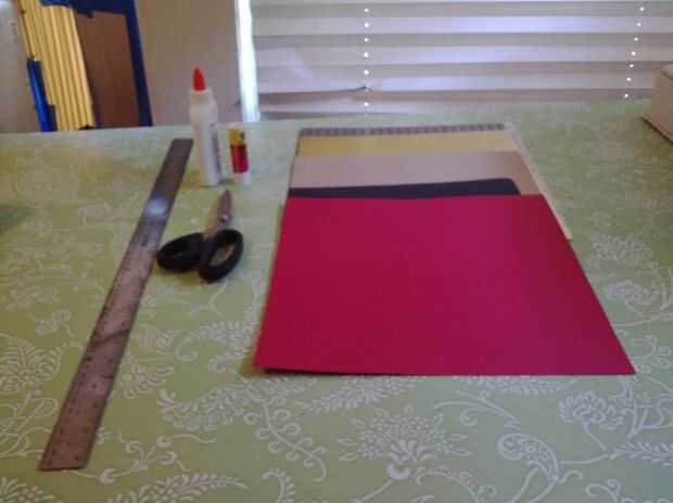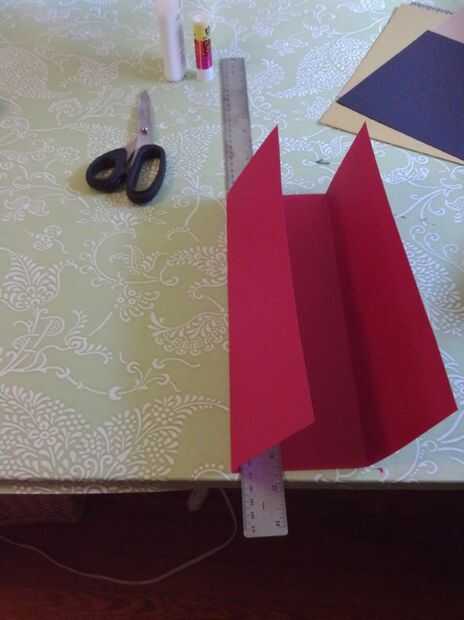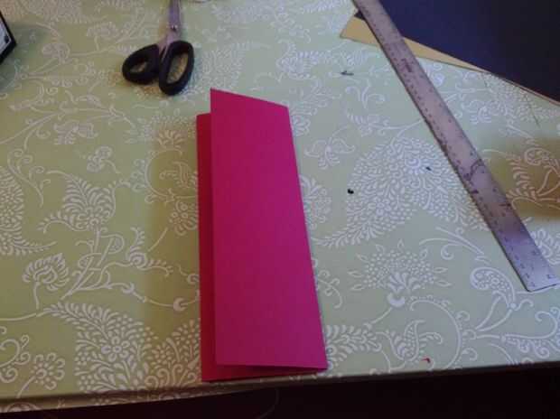 Tomar la cartulina marrón y miden 4 pulgadas de cada borde. Estas dos piezas serán las piezas de la cubierta de la tarjeta. Con mucho cuidado dobla cada extremo hacia el centro. Me gusta usar mi regla como una guía para asegurarse de que obtener un borde tan preciso como sea posible. Terminarás con un pedazo de tríptico de cartulina.