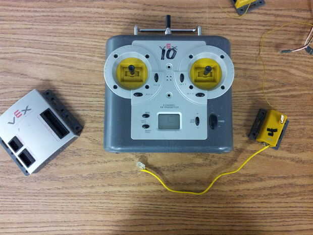 Fije el 7.4V batería VEX y receptor para las ranuras apropiadas en la parte inferior del microcontrolador. Encender el microcontrolador y el transmisor (la cosa buscando controlador); el microcontrolador VEX debe tener una luz verde el transmisor.