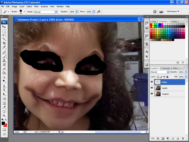 Utilizar la herramienta Pincel para pintar de negro alrededor de los ojos. El tamaño del pincel sobre el tamaño de los zócalos del ojo.