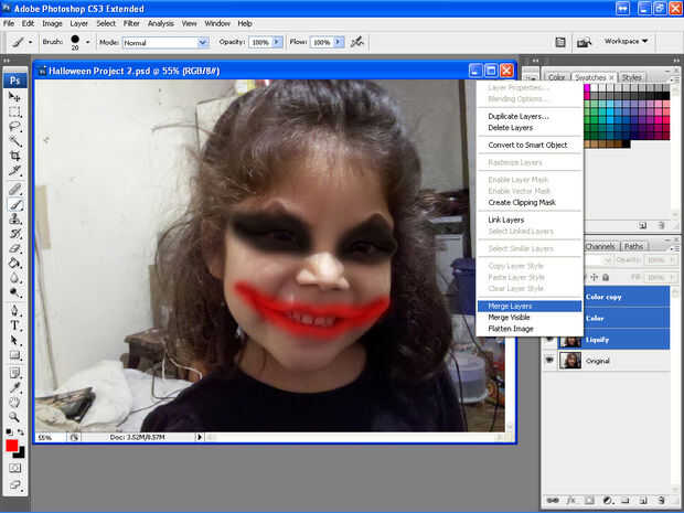 Combinar el "Color," "Copia a Color" y "Licuar" las capas juntas en uno haciendo clic derecho y elija combinar capas. (Este paso puede ser diferente en su edición de Photoshop o Photo editor).