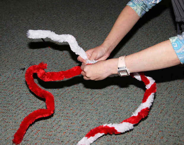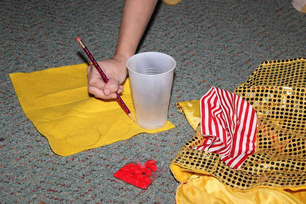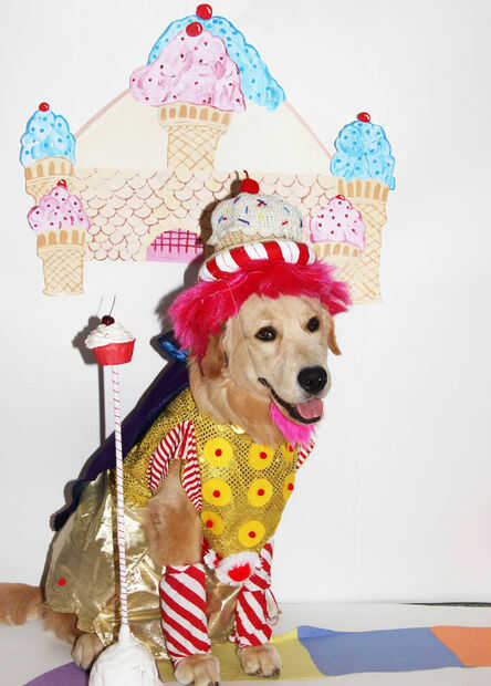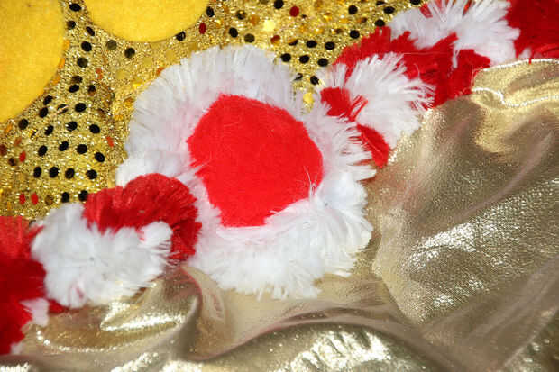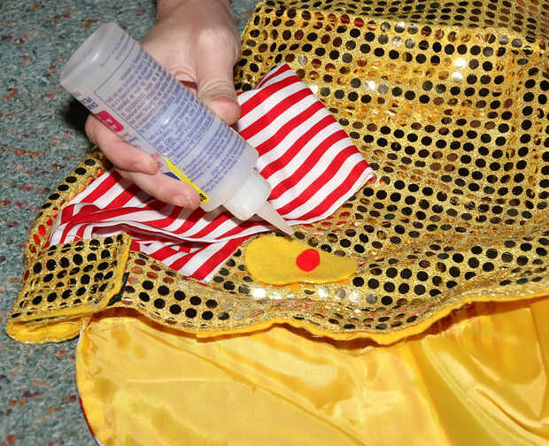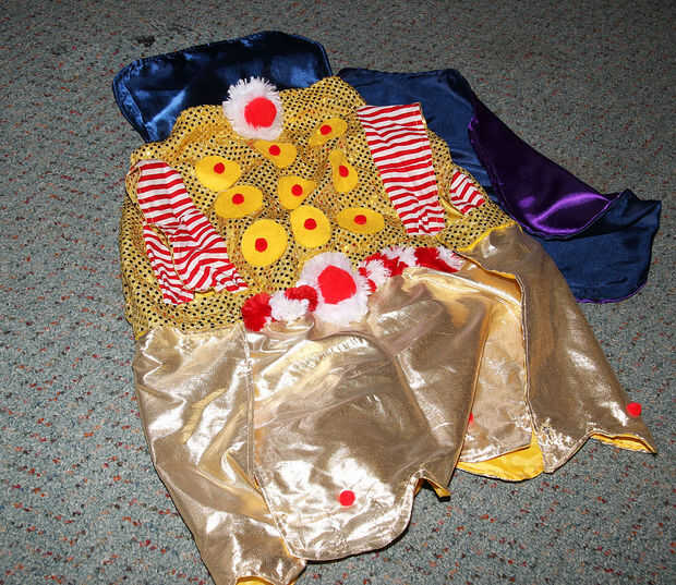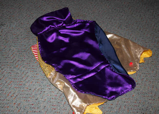 Traje de rey Kandy de Gryphon fue hecho a mano. El traje fue cosido con la tela de lentejuelas oro para la parte superior de la túnica con lamé oro para hacer una pieza de falda-como para la parte inferior de la túnica. El tejido a rayas rojo y blanco fue utilizado para agregar mangas coloridas. El cabo en la parte posteriora es satén púrpura con azul de raso, con un collar que se levanta detrás de su cuello. Hemos tratado de copiar el aspecto de rey Kandy del juego, que parecía tenía galletas de linzer torte en el pecho. Para recrear las galletas, nos trazó círculos (utilizando la parte inferior de un vaso de plástico de tamaño estándar) a amarillento sentía. Luego corte los círculos y había pegado en filas en la parte delantera de la túnica. En cada círculo, nos pegan en un pom pom rojo pequeño. A continuación hicimos un cinturón. Se utilizaron los tallos de chenille rojo y blanco jumbo para formar un bastón de caramelo colocando un tallo rojo y blanco al lado y hacer giros en el mismo sobre cada dos pulgadas. Utilizamos otra pieza de un tallo de chenille blanco para formar un círculo lo suficientemente grande como para caber alrededor de un pom pom rojo grande. Luego pegan los extremos del tallo y pegar el pom pom rojo en el centro. Hicimos dos de estos. Entonces nos pega el cinturón alrededor de la cintura de la túnica con uno de los círculos y pompones en el centro y el otro en el centro de la zona del cuello, como un broche.