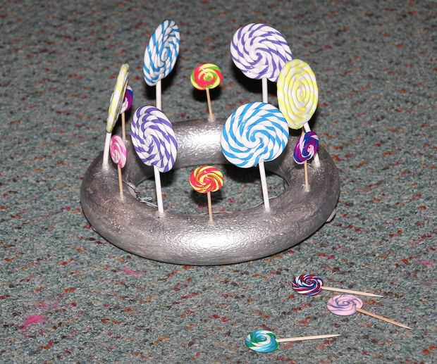 Para el casco, hemos pintado una plata del anillo de espuma de poliestireno, dándole varias capas para que el aspecto de plata brillante. Compró paletas de arcilla en dos tamaños y dispuestos en un círculo alrededor del anillo. Utilizamos una regla para intentar uniformemente puntos de lápiz de espacio alrededor del anillo, donde iría las piruletas. A continuación se empuja cada piruleta en la espuma de poliestireno y caliente pegué en lugar. Entonces nos encadenan elástico en el aro de espuma de poliestireno de la misma manera como el rey traje, empujando a través de la espuma de poliestireno en cualquiera de los extremos. También ponemos una cuerda elástica a través de la peluca rosa tirabuzón, por lo que podrían ser usados juntos.