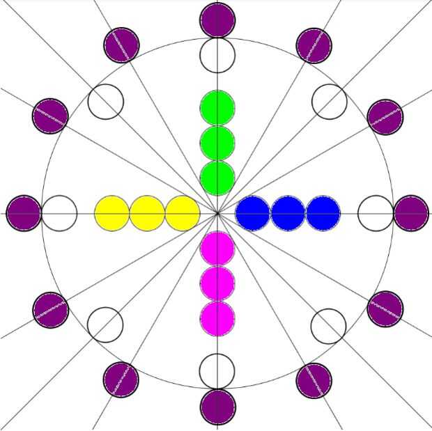 Entonces de color el anillo exterior de los círculos en los múltiplos de π/6 radianes (o 30° en grados) de un color...