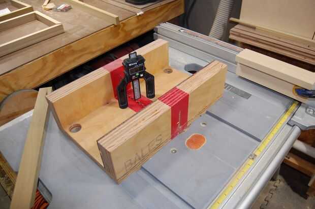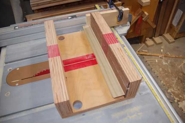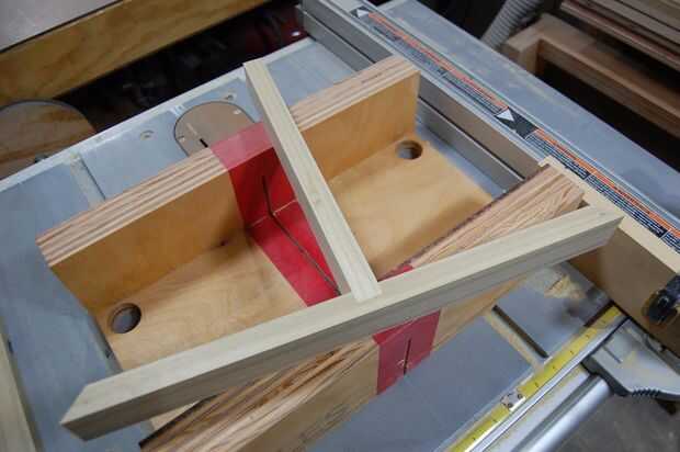 Para cortar las mortajas, usé el trineo del crosscut de pequeña parte en la Sierra de mesa con la altura de la hoja a 3/8" sobre el trineo. Comentar el centro inicial y un bloque de tope por un trozo de madera a la guía de sujeción. De esta manera puedo hacer uno cortar, girar la tabla 180 grados y luego realizar un segundo corte para lograr un dado perfectamente centrado. Mover la valla a la derecha y hacer dos cortes más como este, aumenta la anchura de la ranura. Repetí este proceso hasta que el divisor de centro encaja perfectamente en la ranura.