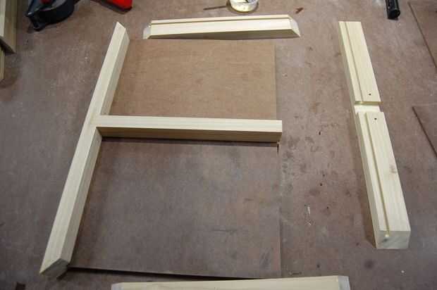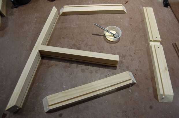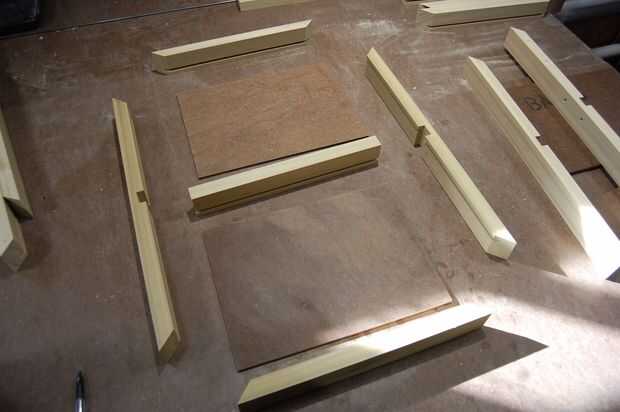 Para proyectos pequeños como este, me gusta aplicar el pegamento con un pincel ácido (que se encuentra en la sección de fontanería de la ferretería). Empecé con los cortes de inglete desde que supe que la veta aspiraría en algunos del pegamento... luego el dado de centro, seguida por una segunda capa en los ingletes. Salí de la parte inferior paneles libre flotación.