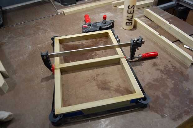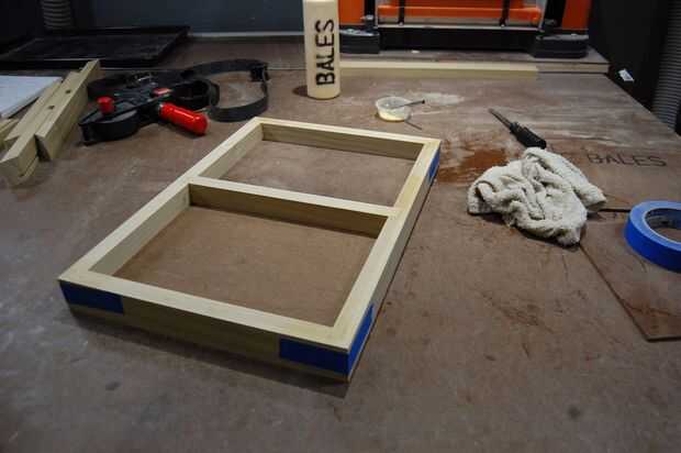 He encontrado el orden más fácil de Asamblea a ser comenzando con el divisor de centro y puntos de conexión lateral. Luego deslice los paneles de la parte dos inferior, añadir los dos extremos cortos y use cinta azul para sostener las esquinas cerradas. Agregar una abrazadera de banda porque yo los tengo, pero no era totalmente necesario. También he añadido una abrazadera de F al centro para el divisor de centro fue fijada en la parte inferior de la ranura.
