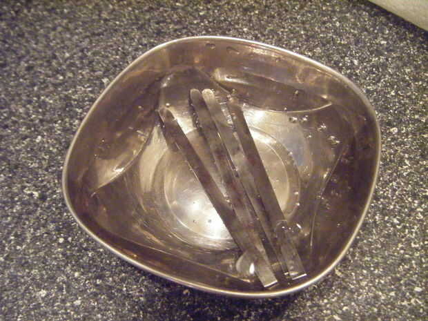 Cortar el dedo de rastrillo solo en cuatro, secciones lengthed igualmente . La longitud que se usaba era la distancia exacta entre los lados de la frontera de oro en la lata. La longitud aproximada es de 3 1/4".