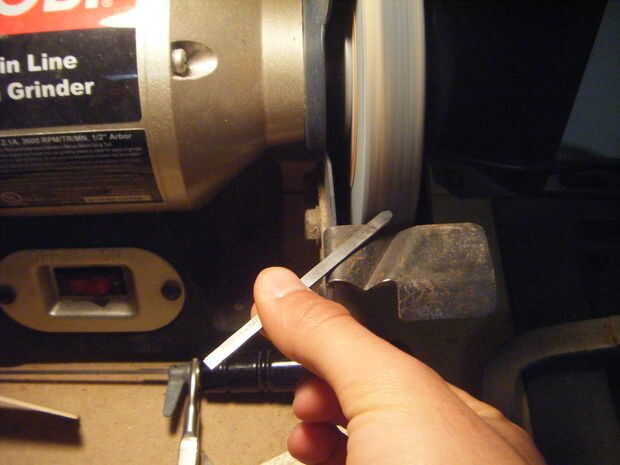Usando una amoladora de banco, o molino de mano, redondo y opacar el extremo de la llave que jugará con los pulgares. Podría ser una buena idea para opacar al otro lado también para reducir el riesgo de cortarse en el borde dentado.