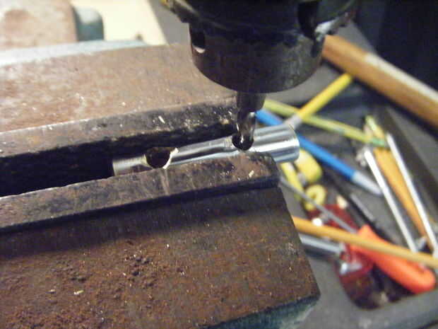 Coloque el tubo de corte 3/8" en una prensa o abrazadera abajo de alguna otra manera. Es el momento para perforar los dos agujeros en el tubo para los tornillos de máquina. Perforar hacia abajo a través del tubo. El medio de ambos agujeros debe ser exactamente 1/2" de cada extremo del tubo. Esto permite incluso separación de las teclas (dos entre los tornillos) y dos en el exterior de los tornillos. Asegúrese de que la broca que use es un poco más ancha que los tornillos que usas para que no tengas los tornillos a través de la fuerza. Esto es todo aproximado así que asegúrese de que los agujeros de taladro en el tubo se alineen con los agujeros perforados en la tapa de la lata.