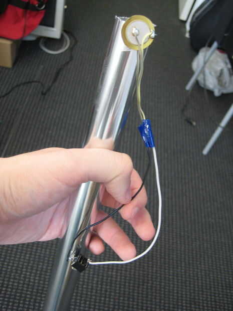 Con cinta de doble cara, coloque el elemento piezoeléctrico en el borde superior dentado de su kickamastick.