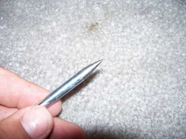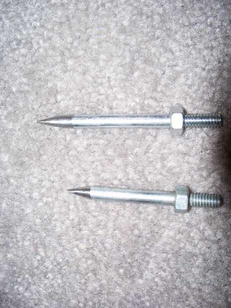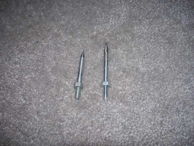 Lo que usted quiere aquí, es tomar tu recta, pernos de 1/4-20 y moler las cabezas de ellos. Luego tomar los pernos sin cabeza y afila hasta una punta fina. Afile el lado de que usted sólo de tierra la cabeza.