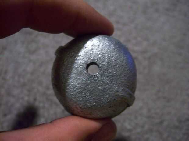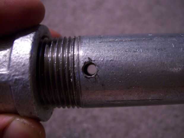 A continuación, marque dos puntos en su tubería galvanizada. Cada uno irá en lados opuestos, directamente debajo de los hilos en la parte superior de la tubería. Si eso suena totalmente claro, por favor mire cuadro #3 en esta página. Haces una marca exactamente como esta, y es la imagen espejo en el lado opuesto. Uno en cada extremo de la línea del diámetro, si te gusta. Ahora, perfore un agujero a través de cada marca, como se muestra en el cuadro #4