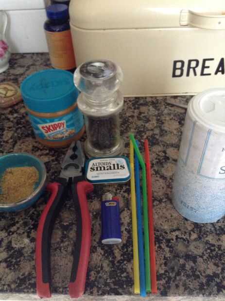 Lo que decidas poner en este juego depende de lo que te gusta. Pero hay algunas cosas que usted necesita para hacer este kit:. Encendedor o fósforos. Cañitas. Toallita desinfectante de mano (para después de la cena). Lata de smalls de Altoids (debe incluir algunas de las mentas como ambientadores de la respiración) aquí están algunas ideas sobre qué incluir en el juego;. Azúcar. Salsa de Tabasco. Salsa de tomate. Sal. Pimienta. Salsa de tomate. Mostaza. Mayonesa. Romero. Queso en polvo. Sabio