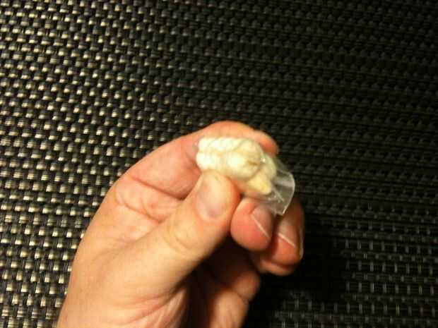a continuación va la batería de arranque y repuestos de fuego, bola de algodón (en la parte inferior izquierda), cordeles y Quik de Yesca.  Doblé el Quik de Yesca en la mitad de su poco holgados así tomaría menos espacio.