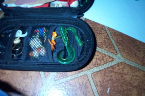 Tomar todos sus ganchos y ponerlos cuidadosamente en uno de los bolsillos pequeños en el caso de la psp. Y para los ganchos de cuelguen hacia fuera (si no se atascan en la tela). Luego rellenar algunos de los Señuelos de pesca de caucho atar junto con una banda elástica y cosas en el bolsillo medio.