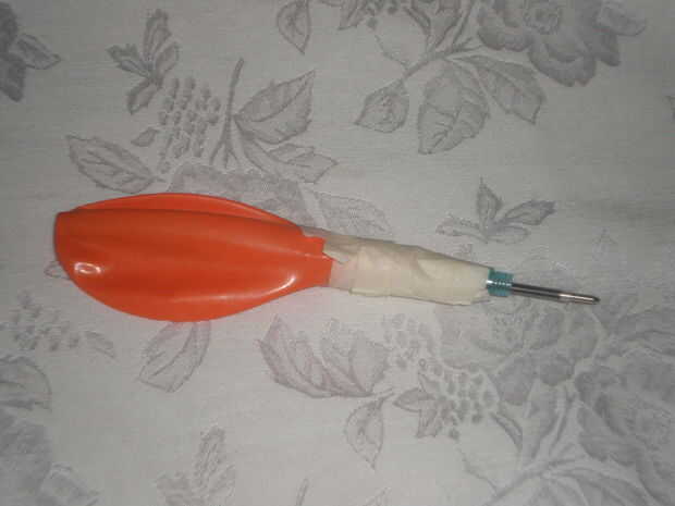 Envuelva la cinta alrededor del cuello del globo cinta adhesiva el globo a la pluma por lo que hay muchas capas de cinta. Asegúrese de que esté apretado.