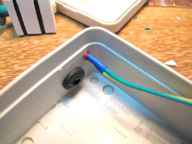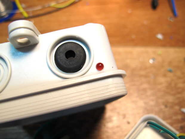 Un agujero se utiliza para mantener el LED en el lugar justo donde la cadena entra en la caja.