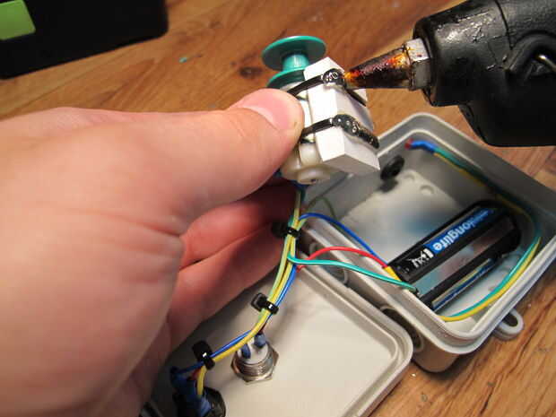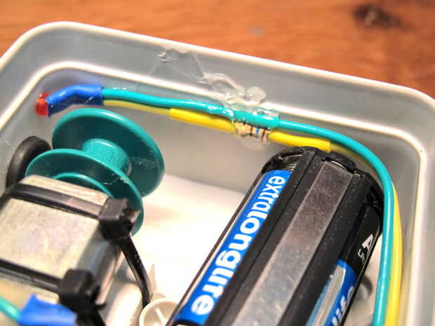 he utilizado pegamento caliente para la base del motor y el cable que suministra alimentación al LED.