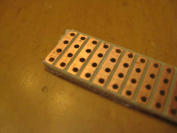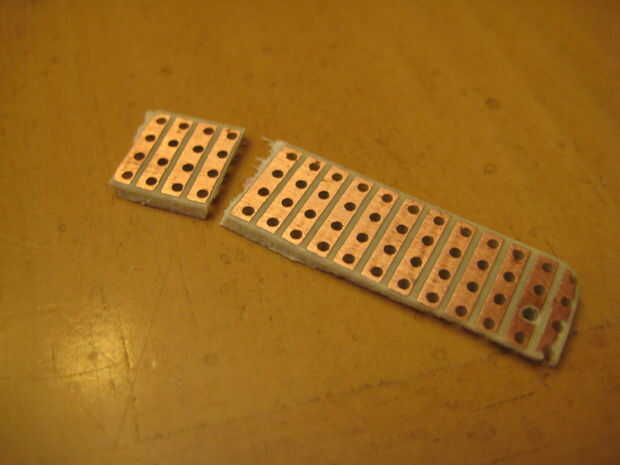 Si su pieza de perfboard no está ya en una tira como la mía, corte algunos anotando el perfboard con su cuchillo X-acto, y luego romperse aparte.
