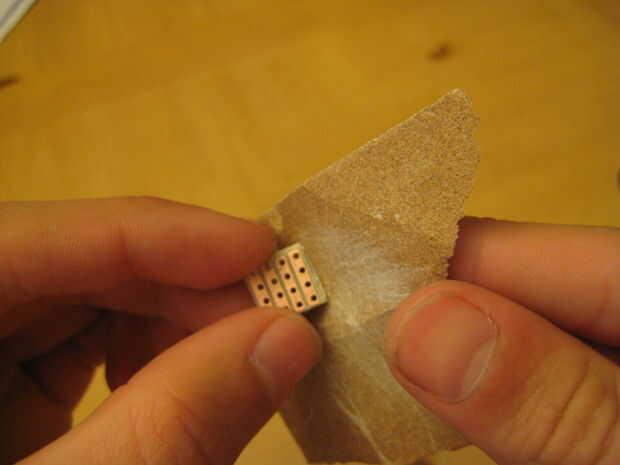 Tomar la tira de perfboard y puntuación cuatro rastros con su cuchillo X-acto (pines USB cuatro = cuatro rastros). Romper la pieza para que tengas una pieza cuadrada que cabe en un puerto USB. Si no encaja bien, lijar un poco para que sea del tamaño correcto.