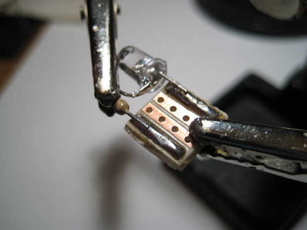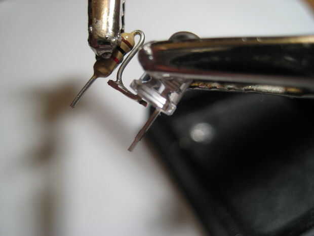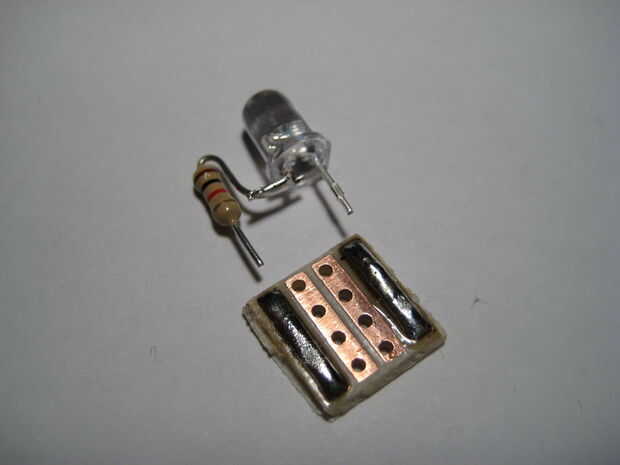 Suelde al combo LED/Resistor el perfboard. Asegúrese de que obtener el derecho de polaridad. En las siguientes imágenes, el lado negativo del LED debe ser en el lado izquierdo, no derecho. Asegúrese de que usted que no desordenar, o tu USB no enciende.