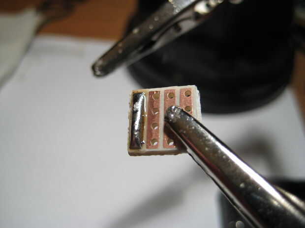 En primer lugar, es necesario rellenar los rastros perfboard con soldadura. Esto es donde puente realmente viene en práctico. : P