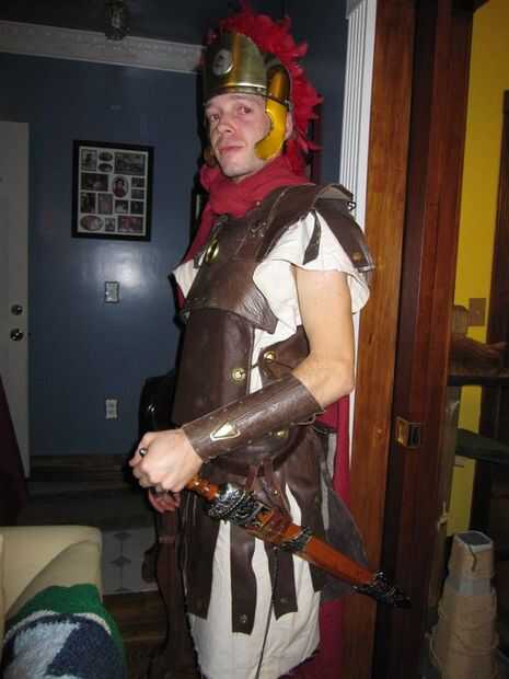 Cortinas de una tienda, una cáscara de huevo y otra roja. Para la túnica, doble cortina, grapar o coser los lados hasta debajo del brazo y corte un orificio de cuello. El manto es la cortina roja, envuelto alrededor de los hombros y atado apagado de manera marcial. Sin problemas en todo y terminar el look muy bien.