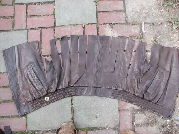 La parte trasera inferior, voltearlo boca abajo y tire la banda elástica alrededor de su cintura. ¿Ver la idea? Todo lo hice desde aquí era cortar aproximadamente 2" tiras un poco más allá de la abertura de la manga, ya que la parte de atrás (donde se unen los bolsillos) probablemente sería cubierto por un manto, de todos modos. La primera tira fue centrada sobre la costura posterior central y trabajado hacia fuera a partir de ahí, terminar con las tiras de alrededor de 14.