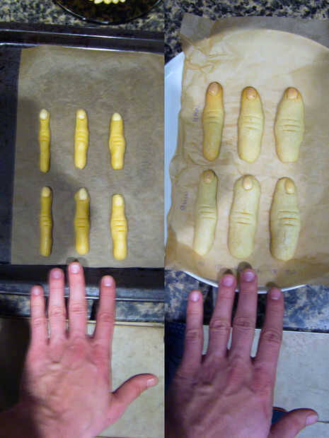 También hubo algún engaño implicados en conseguir el atasco en: he añadido algunos gelatina a la mermelada (alrededor ratio 3:1 mermelada: gelatina), calienta hasta para fundirlo en y esperó un rato después de la mezcla hasta el punto de partida establecer. Esto es un poco complicado si una mayor cantidad de dedos y probablemente tendrás que volver a calentar la mermelada de gelat repetidamente para tener sólo el espesor adecuado para la aplicación. Busca el punto donde no gotea cuando se aplica, sin embargo, todavía se propaga fácilmente. Malvavisco huesos se aplican justo después de poner la mermelada, tu si se pega. También corte las puntas de dedo plano para fácil aplicación de mermelada.