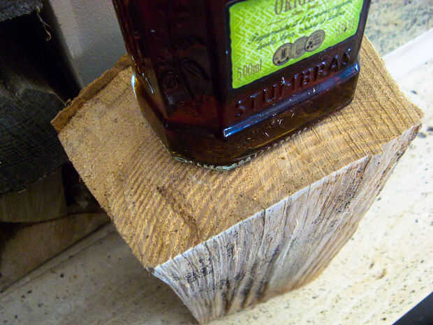 Encontré algunos instructables tazas madera y frascos, pero no sentir es lo quiere hacer o tenía dudas acerca de un funcionamiento correcto, que ha por qué fui por algo un poco diferente - decidió simplemente poner una botella en un trozo de leña.